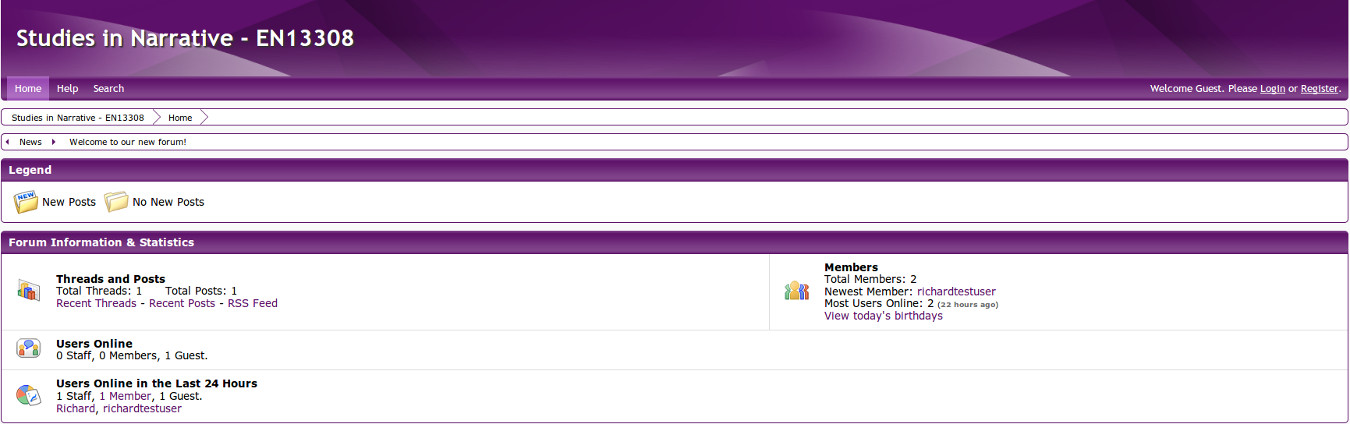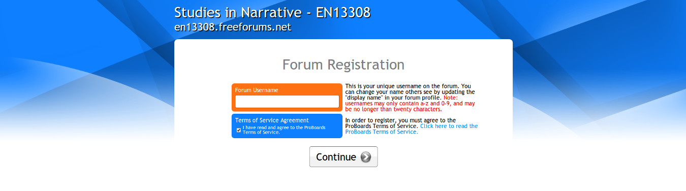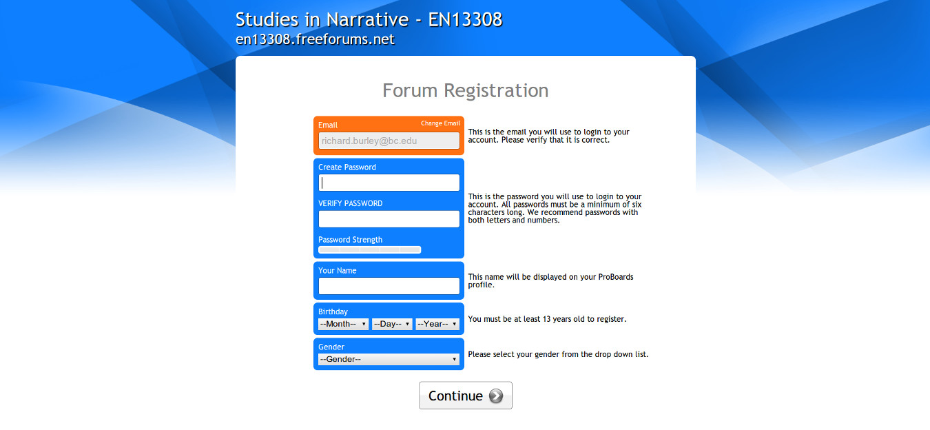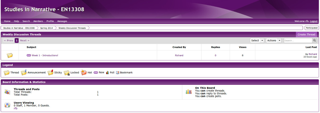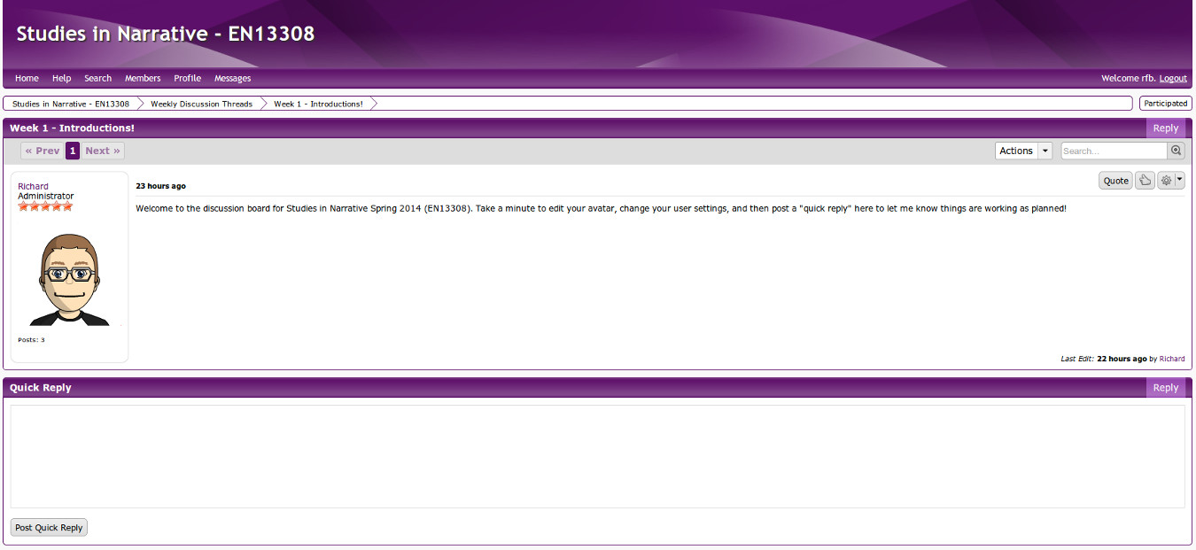 From here on in it functions like any basic discussion thread software. You read the prompts and post a reply. This first week, sign up and respond just to let me know that everything's working right. In future weeks, discussion will be about the texts and the way they function, and you'll be able to skip all this and go straight there from the link on the main page.