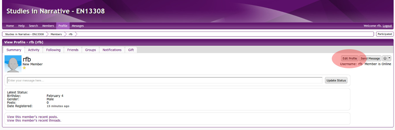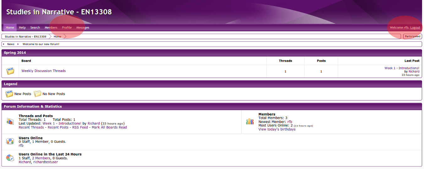 Now the website should let you log in. The upper right will read "Welcome (username). Logout." The first time you log in, click the "Profile" link on the top toolbar and set up your profile and avatar.