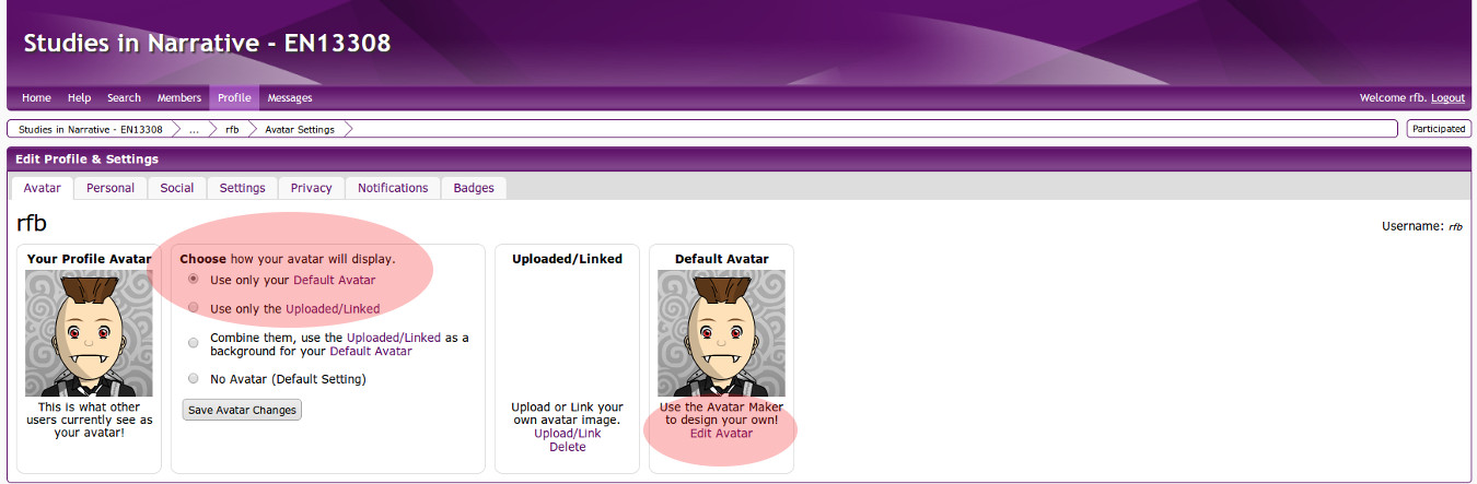 You can now change the avatar setting to "Use Only Your Default Avatar" and click "Edit Avatar" on the right to bring up the avatar creator (which is pretty self-explanatory). You can also use the "Privacy" tab to set who can see your profile, and the "Notifications" tab to let you know when things are happening on the discussion board.